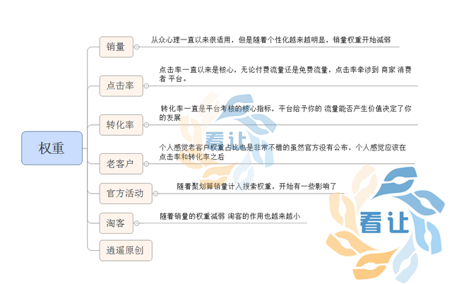 我感觉应该是:点击率+转化率+销量+老客户+其他=权重=流量